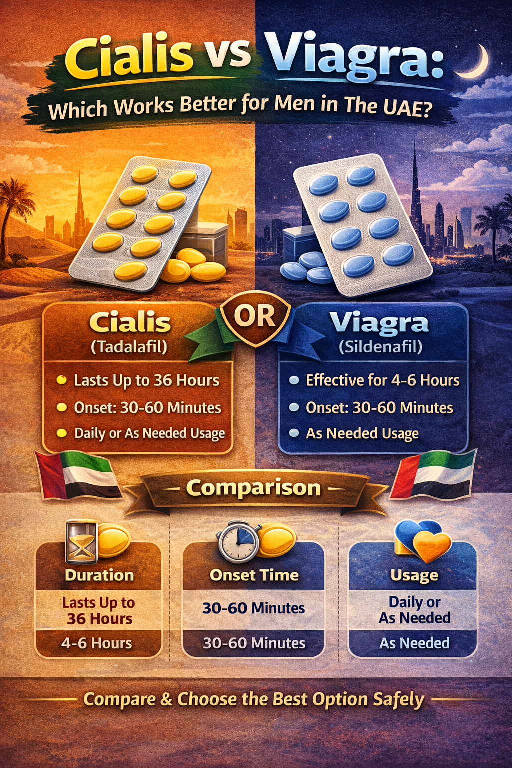 Two names emerge as the main alternatives when men in the UAE seek assistance for their intimate health problems. Most people frequently compare Cialis and Viagra. The two solutions deliver successful outcomes through their unique operational methods. You need to learn how each product functions to select the product that best matches your requirements.